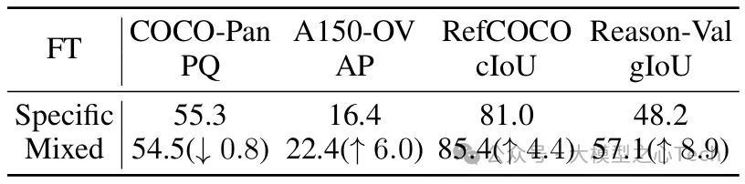 混合微调的价值:仅用单一任务微调时,模型在开放词汇分割(A150-OV)的 AP 为 16.4,而混合微调后提升至 22.4,推理分割的 gIoU 从 48.2 跃升至 57.1。这证明多任务联合训练能显著提升模型的泛化能力,尽管会导致通用分割的 PQ 小幅下降(0.8),但整体收益远超损失。