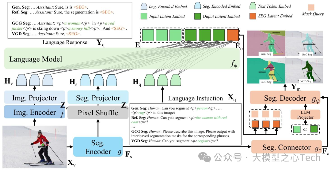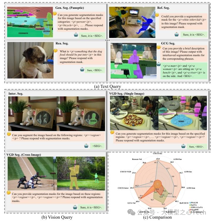 」。对于需要生成描述并同步分割的任务(如 GCG 分割),模型会自动在输出文本中插入<p>标签,再用<SEG>标记分割结果的位置。视觉查询输入:引入