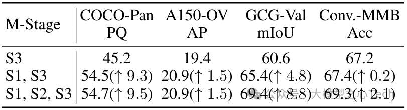 多阶段训练的作用:跳过分割器微调(仅用阶段 3)时,COCO 全景分割的 PQ 仅为 45.2,而加入阶段 1 后提升至 54.5;加入阶段 2 对齐预训练后,图像对话的准确率再提升 2.1%。三步训练环环相扣,缺一不可。