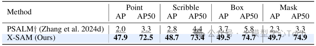 在 COCO-VGD 数据集上的实验显示,X-SAM 在点、涂鸦、框、掩码四种提示形式上的 AP(平均精度)分别达到 47.9、48.7、49.5、49.7,远超 PSALM 模型(仅 2.0-3.7)。这意味着 X-SAM 真正理解了视觉提示的「含义」,而不是简单地对提示区域进行分割。
