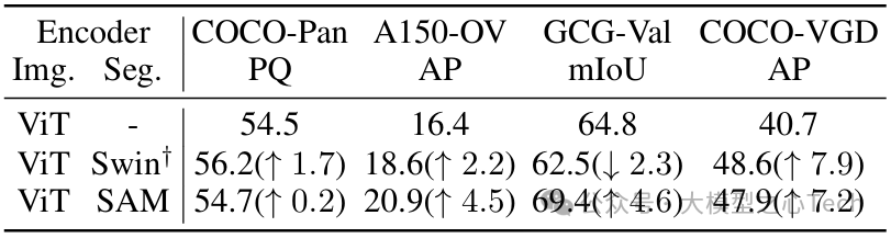 双编码器的优势:对比仅用图像编码器(ViT)、仅用分割编码器(Swin 或 SAM)的方案,双编码器组合能同时优化分割精度和语言理解。其中,SAM 作为分割编码器时,GCG 分割的 mIoU 达到 69.4,远超 Swin 编码器(62.5),证明 SAM 的视觉特征对分割任务至关重要。
