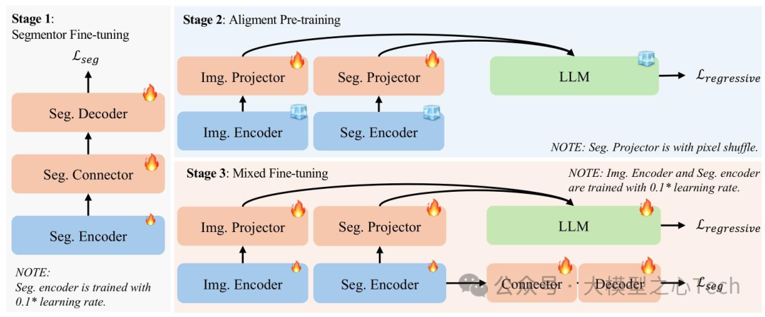 混合微调: 将多种任务的数据集(包括语义分割、referring 分割、VGD 分割、图像对话等)混合训练,同时更新所有模块参数。对于对话任务,采用自回归损失;对于分割任务,则同时使用自回归损失和分割损失。这种「一锅烩」的训练方式,让模型在不同任务间互相促进,而非互相干扰。