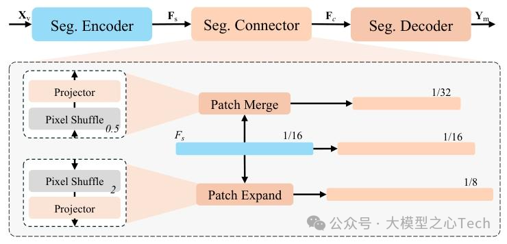 分割连接器(图3): SAM 输出的特征是单一尺度(1/16 分辨率),难以满足精细分割需求。X-SAM 设计了一个「分割连接器」,通过「补丁合并」(patch merge)和「补丁扩展」(patch expand)操作,生成 1/8、1/16、1/32 三种尺度的特征,让分割解码器能同时关注不同大小的物体。