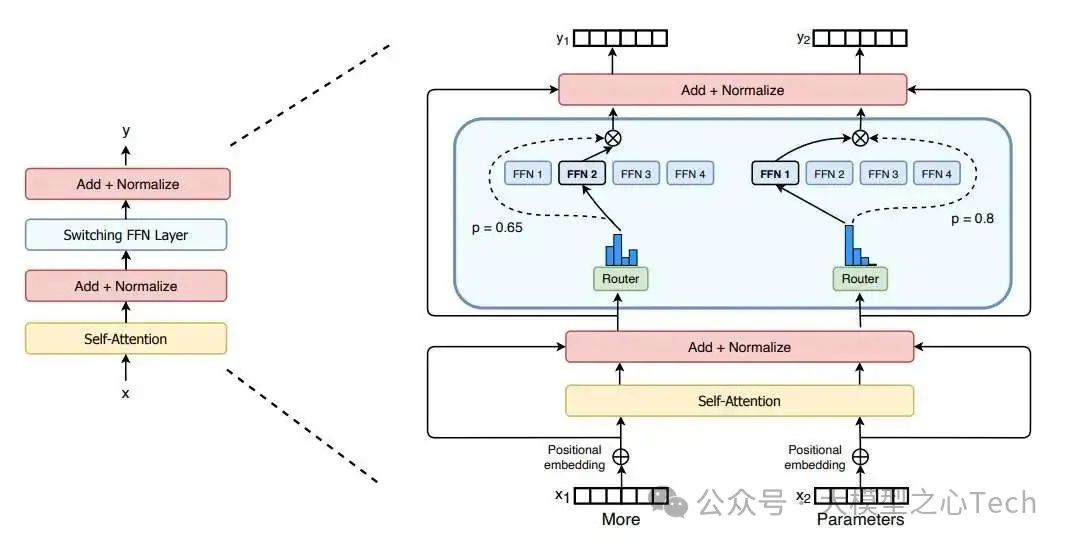 从图中可以看到,一个token输入经过Attention计算并且归一化操作后除了残差分支外,原本通向FFN层的分支进入了MOE层,简单来说,MOE层是由多个FFN组成,每个FFN理论上更关注不同领域知识,也就是所谓的专家,每个token会选择其中的top-K个FFN向前传递,即选择这个token所在领域相关的专家,这个top-K也可能是个权重系数。