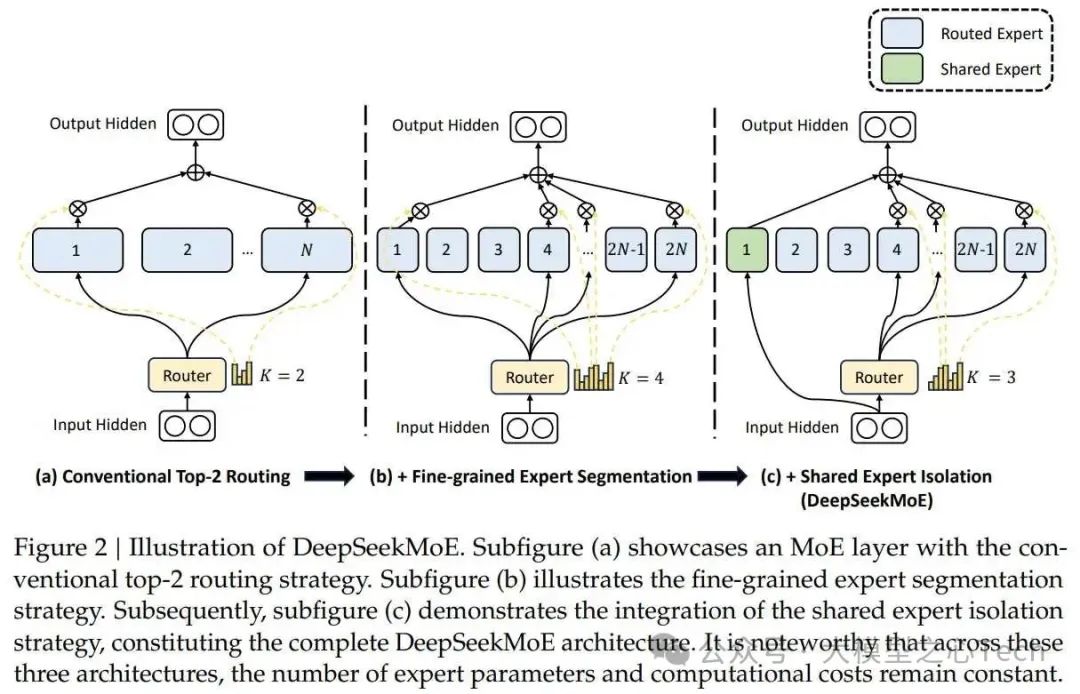 上图中(a)表示之前的MOE架构,专家分的粒度比较粗,并且没有共享专家,图(b)是将专家粒度划分的更细情况,图(c)在图(b)的基础上增加了共享专家。