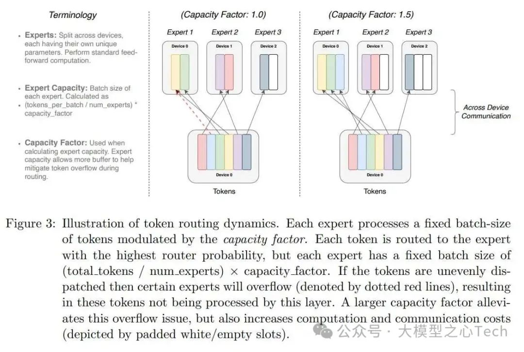 在图中可以发现,当使用专家并行方案时,为了满足分布式中计算、通信、存储的平衡,使用Top-K=1的MOE方案会更加高效,这样对于同一个批次的token来说,不同的token会划分到不同的专家上。这里定义了一个参数叫做capacity_factor(容量因子),容量因子控制这每个专家可以处理的token数量,专家容量计算为(total_tokens / num_experts)* capacity_factor,在上图左侧apacity_factor=1.0中可以看到,假设有6个token,3个专家时,这时apacity_factor=1.0使得每个专家只能处理2个token,当红色虚线部分想给专家1多分配一个token时会发现专家1没有多余的容量去处理这个token,这样也就造成了溢出,那么这个没有专家处理的token就直接残差绕过了这一层的MOE。当apacity_factor=1.5时,每个专家容量变成了3,这样每个token都会有专家来处理。