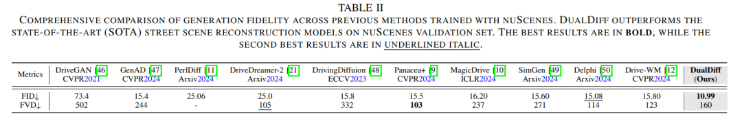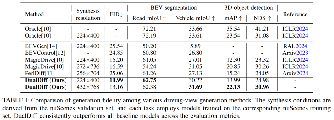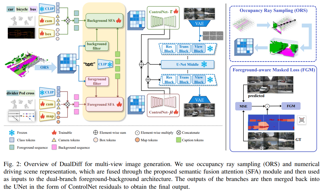 准确且高保真的驾驶场景重建依赖于充分挖掘场景信息作为条件输入。然而,现有方法主要使用3D边界框和二值图进行前景与背景控制,在捕捉场景复杂性和整合多模态信息方面存在明显不足。本文提出DualDiff,一种专为增强多视角驾驶场景生成而设计的双分支条件扩散模型。本文引入了语义丰富的3D表示——占用射线采样(Occupancy Ray Sampling, ORS),并结合数值驾驶场景表示,实现全面的前景与背景控制。为改善跨模态信息整合,本文提出了语义融合注意力(Semantic Fusion Attention, SFA)机制,用于对齐和融合跨模态特征。此外,本文设计了前景感知掩码(Foreground-aware Masked, FGM)损失函数,以增强微小目标的生成质量。DualDiff在FID分数上达到了最先进水平,并在下游的BEV分割和3D目标检测任务中始终取得更优结果。