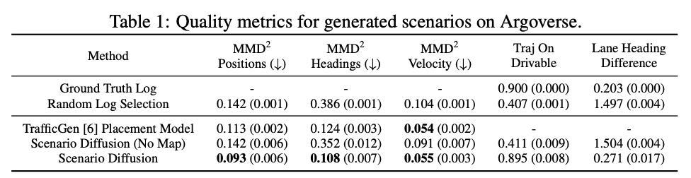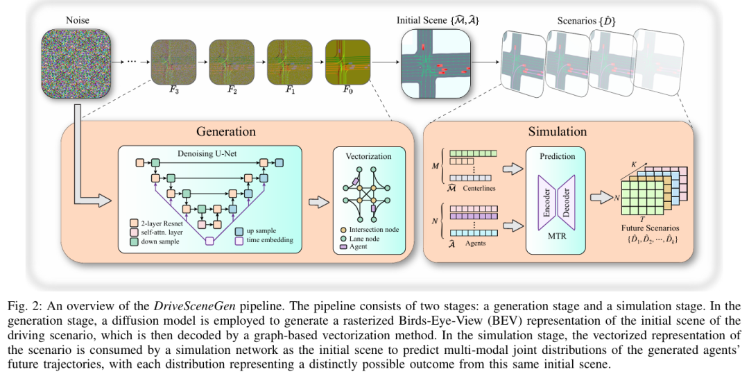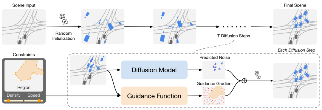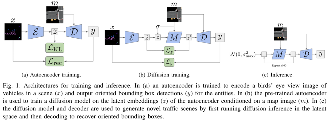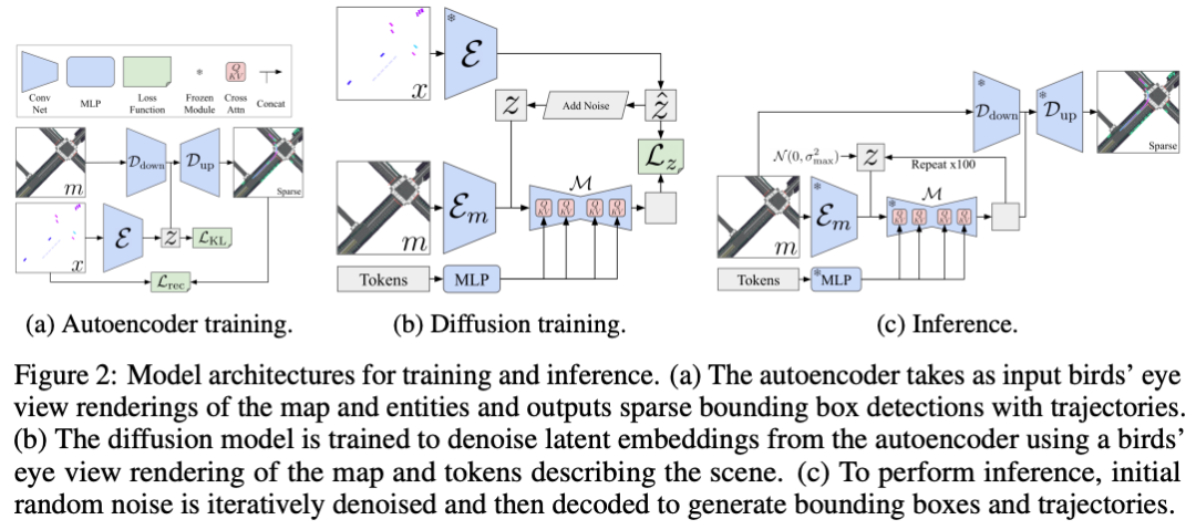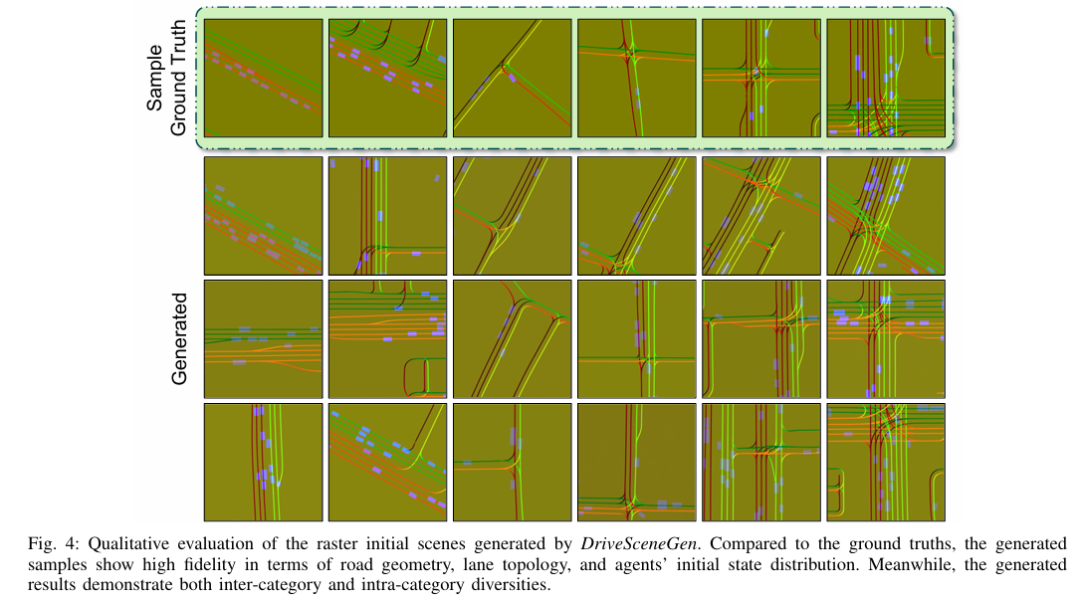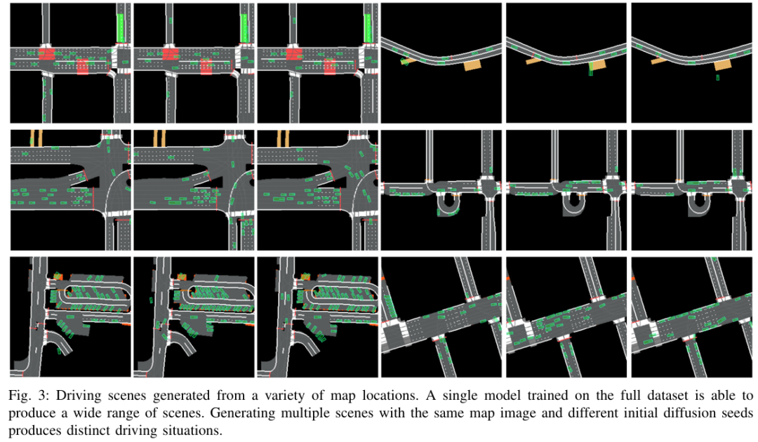 本文提出了一种交通场景生成的习得方法,旨在仿真自动驾驶汽车感知系统的输出。在本文受潜在扩散启发的 “场景扩散”(Scene Diffusion)系统中,本文创新性地结合了扩散模型与目标检测,直接生成具有现实性和物理合理性的智能体离散边界框布局。本文的场景生成模型能够适应美国不同的地区,生成的场景能够捕捉每个地区的复杂特征。
