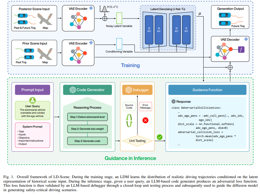 为确保自动驾驶系统的安全性与鲁棒性,需在安全关键场景下进行全面评估。然而,此类场景在真实驾驶数据中稀缺且难以收集,对自动驾驶车辆的性能评估构成重大挑战。现有方法通常因可控性有限且依赖专家知识而缺乏用户友好性。为此,本文提出 LD-Scene——一种融合大语言模型(LLMs)与潜在扩散模型(LDMs)的新型框架,通过自然语言实现用户可控的对抗性场景生成。该框架包含一个学习真实驾驶轨迹分布的LDM,以及一个基于LLM的引导模块,后者将用户查询转化为对抗性损失函数,驱动生成符合用户需求的场景。引导模块集成基于LLM的思维链(CoT)代码生成器和代码调试器,提升了对抗场景生成的可控性、鲁棒性与稳定性。在 nuScenes 数据集上的实验表明,LD-Scene 在生成高对抗性、高真实性与多样性的场景中达到最先进性能,同时支持对对抗行为(如碰撞类型与强度)的细粒度控制,为定制化测试提供有效工具。