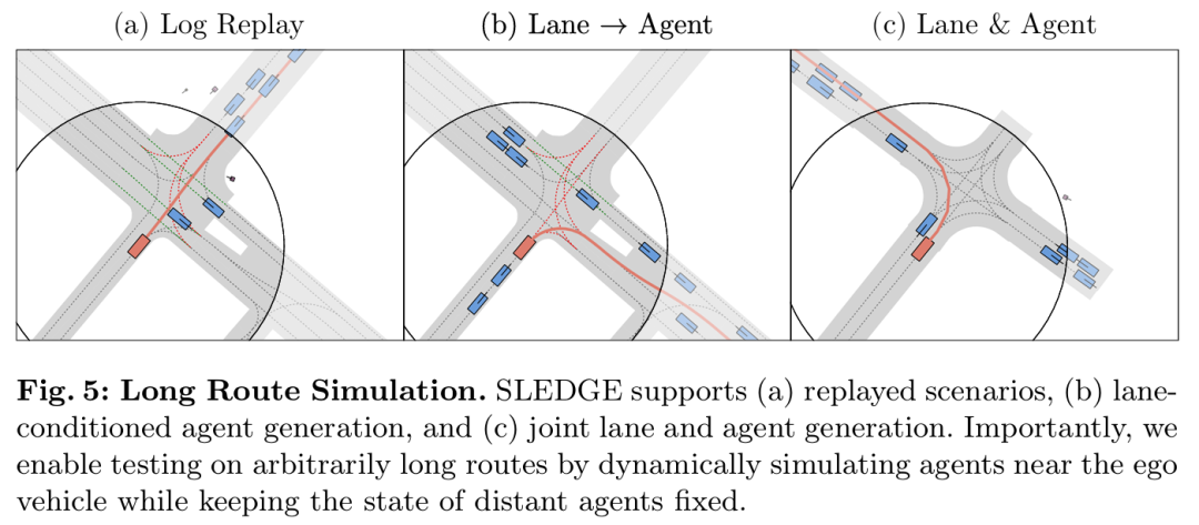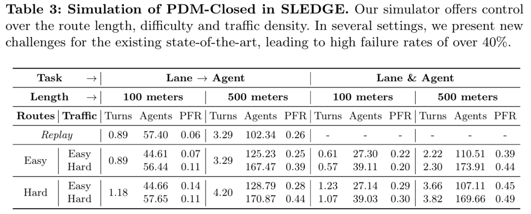 SLEDGE是首个基于真实驾驶日志训练的用于车辆运动规划的生成式仿真器。其核心组件是一个能够生成智能体边界框和车道图的可学习模型。该模型的输出作为基于规则的交通仿真的初始状态。SLEDGE需要生成的实体具有独特的属性,例如它们的连通性和每场景可变的数量,这使得直接应用大多数现代生成模型到此任务上变得非平凡。因此,结合对现有车道图表示的系统研究,本文引入了一种新颖的光栅到矢量的自编码器(raster-to-vector autoencoder)。它将智能体和车道图编码到光栅化潜在地图(rasterized latent map)中的不同通道。这促进了基于车道条件的智能体生成,以及使用扩散Transformer(Diffusion Transformer)联合生成车道和智能体。在SLEDGE中使用生成的实体可以实现对仿真的更大控制,例如对转弯进行上采样或增加交通密度。此外,SLEDGE可以支持500米长的路线,这一能力在现有的数据驱动仿真器(如nuPlan)中是不存在的。它为规划算法提出了新的挑战,当在由本文的模型生成的困难路线和密集交通上进行测试时,2023年nuPlan挑战赛的获胜者PDM的失败率超过40%。与nuPlan相比,SLEDGE的设置所需的存储空间减少了500倍(<4 GB),使其成为一个更易于访问的选择,并有助于推动该领域未来研究的普及化。