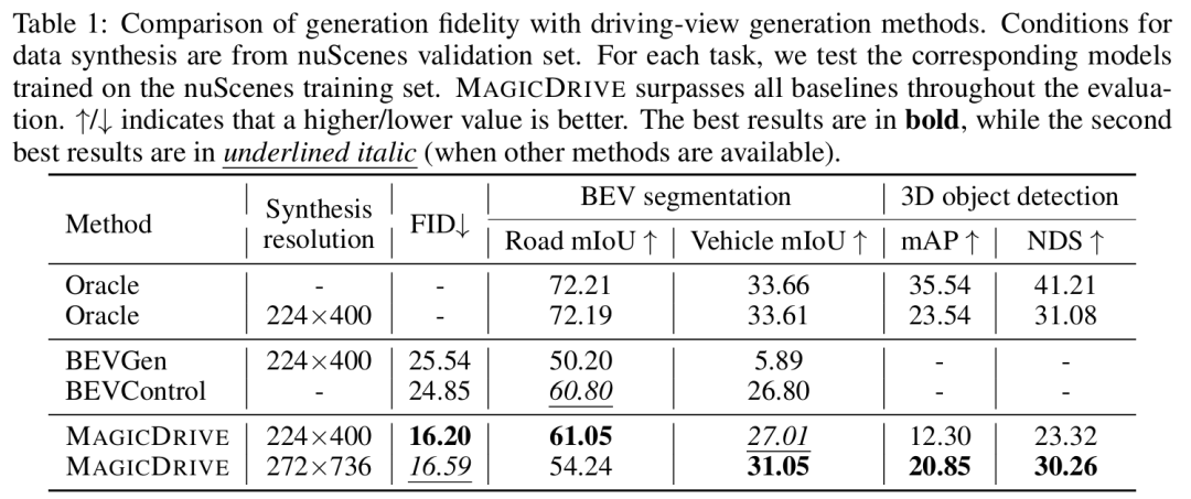 本文提出MAGICDRIVE,一种新型街景生成框架,通过定制化编码策略,融合相机位姿、道路地图、3D 包围盒及文本描述,实现多样化 3D 几何控制。框架设计了跨视图注意力模块,确保多相机视角一致性。实验表明,MAGICDRIVE 能生成高保真街景图像 / 视频,捕捉细微 3D 几何特征(如车辆高度、路面起伏),显著提升 BEV 分割和 3D 目标检测任务性能。与现有方法(如 BEVGen、BEVControl)相比,MAGICDRIVE 通过分离前景(3D 包围盒)与背景(道路地图)编码,避免了 BEV 投影导致的几何信息丢失,同时支持天气、时间等场景属性控制。
