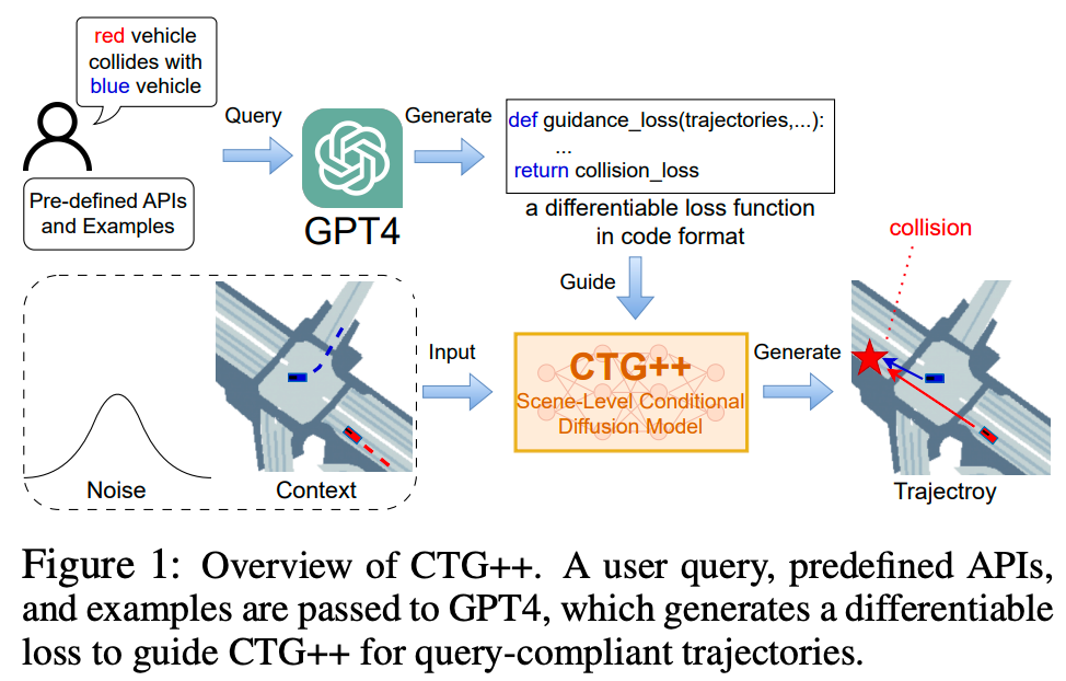 真实且可控的交通仿真技术是加速自动驾驶车辆(AV)开发的核心能力。然而当前控制基于学习的交通模型的方法需要深厚的领域专业知识,对于从业者而言难以使用。为解决这一问题,我们提出了CTG++,这是一种场景级条件扩散模型,可通过语言指令进行引导。开发这一模型需要应对两大挑战:一是需要一个真实且可控的交通模型主干;二是需要一种有效的方法来使用语言与交通模型进行交互。为应对这些挑战,我们首先提出了一种配备时空Transformer主干的场景级扩散模型,该模型能够生成真实且可控的交通。然后,我们利用大型语言模型(LLM)将用户的查询转换为损失函数,引导扩散模型生成符合查询要求的交通。通过综合评估,我们证明了所提方法在生成真实且符合查询要求的交通仿真方面的有效性。