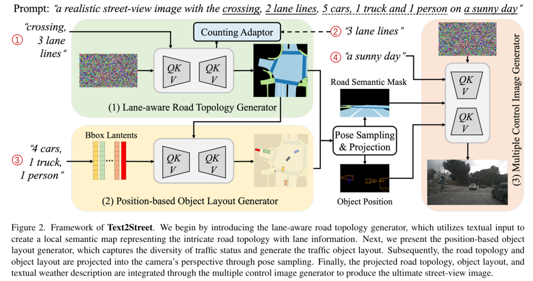 多控制图像生成器:融合投影后的道路语义掩码、目标布局和天气文本,通过 ControlNet 和位置编码实现多条件协同控制,最终生成符合交规、数量精准且场景一致的街景图像。