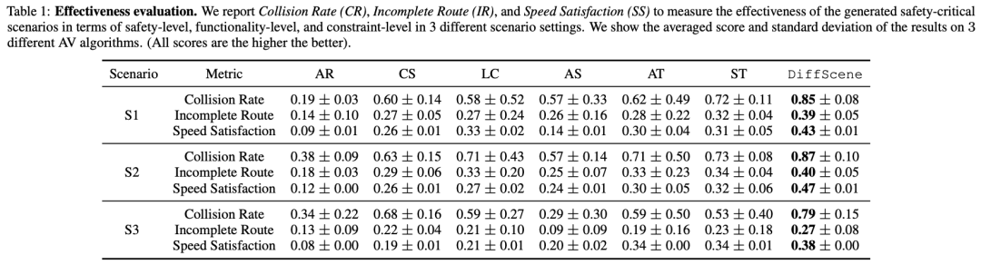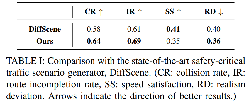 自动驾驶(AD)领域近年来取得了显著进展。在所面临的各种挑战中,自动驾驶车辆(AV)的安全评估尤为关键。传统评估方法既昂贵又低效,往往需要大量的行驶里程才能遇到罕见的安全关键场景,而这些场景分布在复杂现实世界驾驶场景的长尾区域。在本文中,我们提出了一种统一的方法——基于扩散的安全关键场景生成(DiffScene),用于生成既真实又安全关键的高质量安全关键场景,以实现高效的自动驾驶评估。具体而言,我们提出了一个基于扩散的生成框架,利用扩散模型近似低密度空间分布的能力。我们设计了多个对抗性优化目标,以在预定义的对抗性预算下指导扩散生成。这些目标,如基于安全的目标、基于功能的目标和基于约束的目标,确保在遵守特定约束的同时生成安全关键场景。我们进行了大量实验来验证我们方法的有效性。与6个最先进的基线方法相比,DiffScene生成的场景(1)在3个指标上更具安全关键性,(2)在5个距离函数上更真实,(3)对不同自动驾驶算法更具可转移性。此外,我们还证明了,与基线方法相比,使用DiffScene生成的场景训练自动驾驶算法在安全关键指标方面表现显著提升。这些发现凸显了DiffScene在解决自动驾驶安全评估挑战方面的潜力,为更高效、更有效的自动驾驶开发铺平了道路。