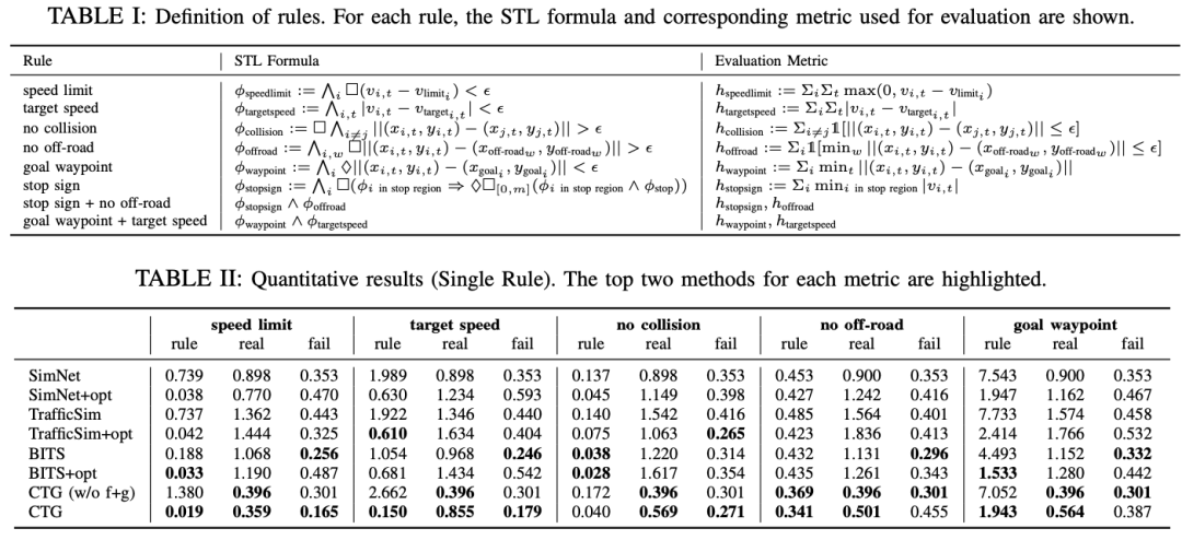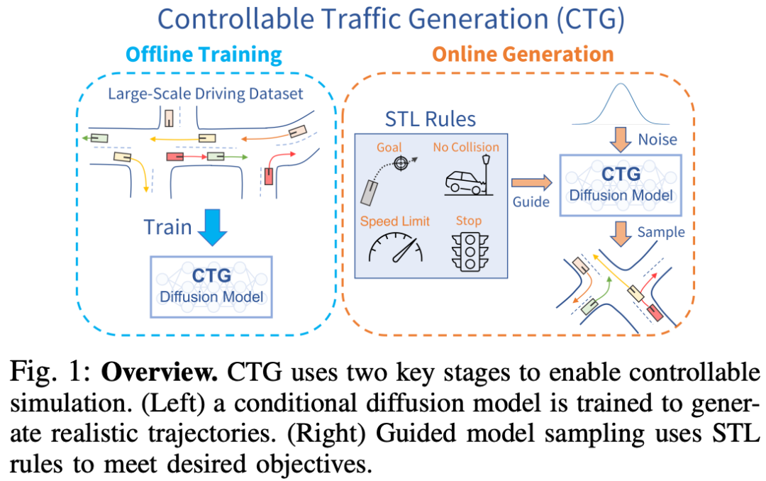 可控且逼真的交通仿真对于开发和验证自动驾驶车辆至关重要。典型的基于启发式的交通模型提供灵活的控制,使车辆能够遵循特定的轨迹和交通规则。另一方面,数据驱动的方法能够生成逼真且类似人类的行为,从而改善从仿真到真实交通的迁移。然而,据我们所知,尚无交通模型同时具备可控性和逼真性。在本文中,我们开发了一种用于可控交通生成(CTG)的条件扩散模型,该模型允许用户在测试时控制轨迹的期望属性(例如,到达目标或遵守限速),同时通过强制动力学保持逼真性和物理可行性。关键技术思想是利用扩散建模和可微逻辑的最新进展,引导生成的轨迹满足使用信号时态逻辑(STL)定义的规则。我们进一步将引导扩展到多智能体设置,并启用基于交互的规则,如避免碰撞。CTG在nuScenes数据集上针对多种复合规则进行了广泛评估,在可控性与逼真性的权衡方面,其表现优于强大的基线模型。