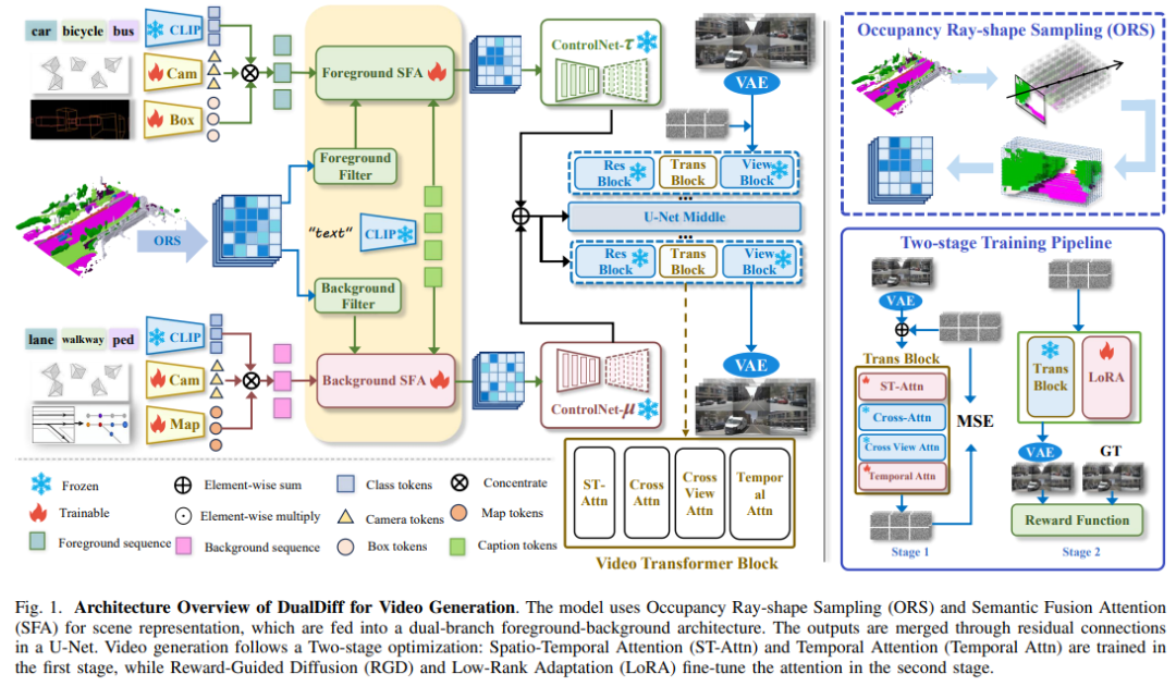 精确且高保真的驾驶场景重建需要有效利用全面的场景信息作为条件输入。现有方法主要依赖 3D 边界框和BEV道路图来控制前景和背景,但其无法捕捉驾驶场景的全部复杂性,也不能充分融合多模态信息。在本研究中,本文提出了 DualDiff,一种双分支条件扩散模型,旨在提升多视角和视频序列的驾驶场景生成效果。具体而言,本文引入占用率射线形状采样(ORS)作为条件输入,其提供丰富的前景和背景语义信息以及 3D 空间几何结构,以精确控制两者的生成。为改善细粒度前景目标(尤其是复杂和远处目标)的合成效果,本文提出了前景感知掩码(FGM)去噪损失函数。此外,本文开发了语义融合注意力(SFA)机制,以动态优先处理相关信息并抑制噪声,实现更有效的多模态融合。最后,为确保高质量的图像到视频生成,本文引入奖励引导扩散(RGD)框架,以维持生成视频的全局一致性和语义连贯性。大量实验表明,DualDiff 在多个数据集上实现了最先进(SOTA)的性能。在 NuScenes 数据集上,与最佳基线相比,DualDiff 将 FID 分数降低了 4.09%。在下游任务中,如 BEV 分割,本文的方法将车辆 mIoU 提升了 4.50%,道路 mIoU 提升了 1.70%;在 BEV 3D 目标检测中,前景 mAP 提高了 1.46%。