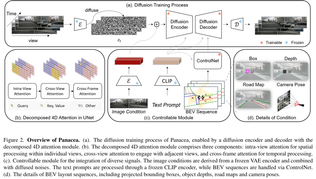 该方法融合了新型 4D 注意力机制 与 两阶段生成流程 以维持一致性,并通过 ControlNet 框架 实现对鸟瞰图(BEV)布局的精细化控制。在 nuScenes 数据集上的定性与定量实验表明,Panacea 能高效生成高质量多视角驾驶场景视频。本工作通过增强 BEV 感知技术的训练数据,显著推动了自动驾驶领域发展。