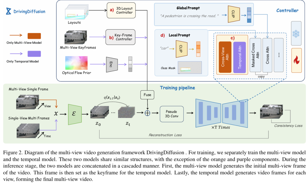 随着基于强大且统一的BEV表示的自动驾驶技术日益普及,对高质量、大规模且具有精确标注的多视角视频数据的需求变得尤为迫切。然而,由于采集和标注成本高昂,此类大规模多视角数据难以获取。 为缓解这一问题,本文提出了一种时空一致的扩散框架DrivingDiffusion,用于生成由3D布局控制的真实多视角视频。 在给定3D布局合成多视角视频时存在三个主要挑战:如何保持1)跨视角一致性;2)跨帧(时间)一致性;3)如何保证生成实例的质量?本文的DrivingDiffusion通过级联多视角单帧图像生成步骤、多摄像头共享的单视角视频生成步骤以及可处理长视频生成的后处理步骤来解决这些问题。在多视角模型中,通过相邻摄像头之间的信息交换确保多视角图像的一致性。在时序模型中,本文主要从第一帧的多视角图像中查询后续帧生成所需关注的信息。本文还引入了局部提示(local prompt)来有效提高生成实例的质量。在后处理中,本文通过采用时序滑动窗口算法进一步增强后续帧的跨视角一致性并扩展视频长度。无需额外成本,本文的模型能够在复杂城市场景中生成大规模真实多摄像头驾驶视频,为下游驾驶任务提供支持。