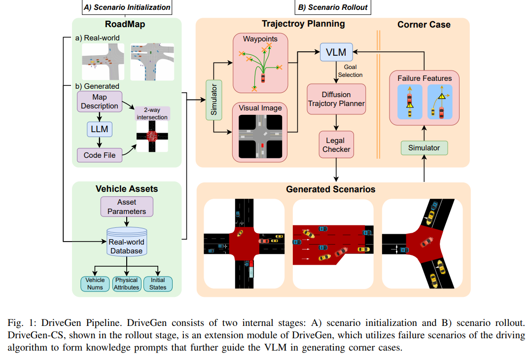 交通仿真已成为自动驾驶训练与测试的重要工具。尽管当前数据驱动方法提升了行为生成的逼真度,但其学习过程仍主要依赖单一真实数据集,限制了场景多样性,进而阻碍下游算法优化。本文提出 DriveGen——一种基于大模型的新型交通仿真框架,可生成多样化交通场景并支持定制化设计。DriveGen 包含两个核心阶段: