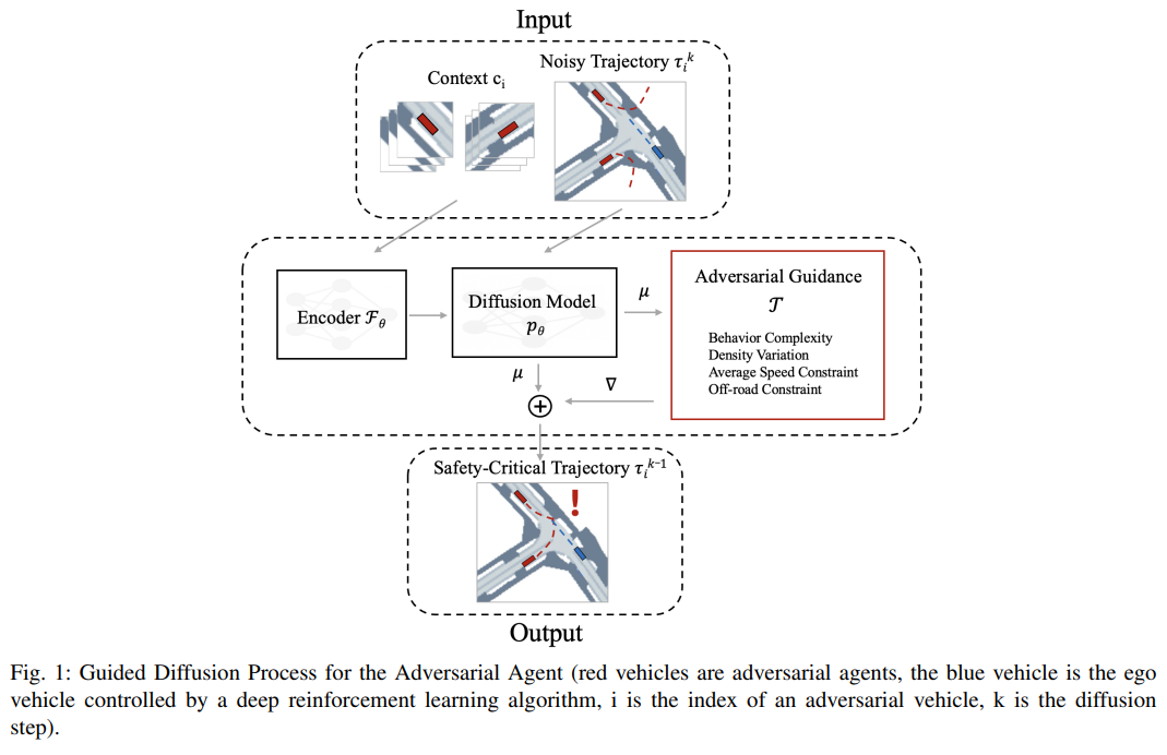 安全关键交通场景是自动驾驶系统开发与验证的核心组成部分。这些场景能为车辆在现实世界中罕见的高风险条件下的响应提供关键见解。近年来,在关键场景生成领域的进展表明,与传统生成模型相比,基于扩散模型的方法在有效性和真实性方面具有显著优势。然而,当前基于扩散模型的方法未能充分解决驾驶员行为复杂性和交通密度信息的问题,而这两者均对驾驶员的决策过程有重要影响。在本研究中,本文提出了一种新颖的方法来克服这些局限性,通过为扩散模型引入融合行为复杂性和交通密度的对抗性引导函数,从而增强更有效、更真实的安全关键交通场景的生成。所提方法通过有效性和真实性两个评估指标进行评价,结果表明,与其他最先进的方法相比,该方法具有更优的效能。