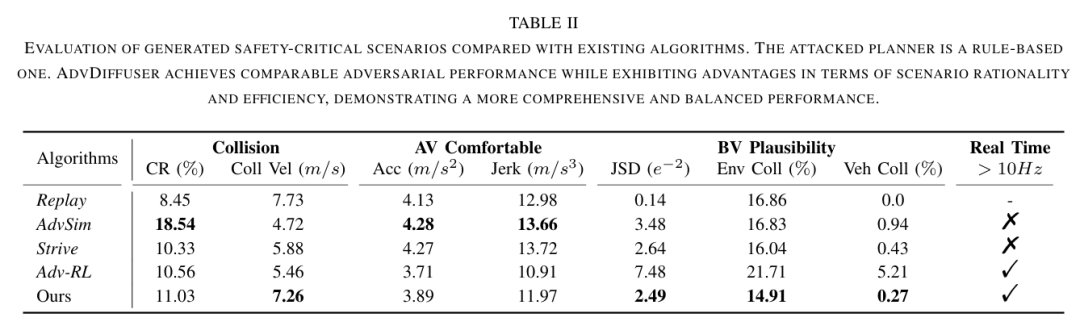 安全关键场景在自然驾驶环境中虽不常见,但对自动驾驶系统的训练与测试至关重要。当前主流方法通过对自然环境引入对抗性调整,在仿真中自动生成安全关键场景。然而,这些调整通常针对特定被测系统设计,缺乏跨系统的可迁移性。本文提出 AdvDiffuser——一种基于引导扩散的对抗性框架,用于生成安全关键驾驶场景。该框架结合扩散模型捕捉背景车辆的合理群体行为,并利用轻量级引导模型有效处理对抗场景,从而提升可迁移性。在 nuScenes 数据集上的实验表明:AdvDiffuser 基于离线驾驶日志训练,仅需极少量预热回合数据即可适配多种被测系统,且在真实性、多样性和对抗性表现上均优于现有方法。