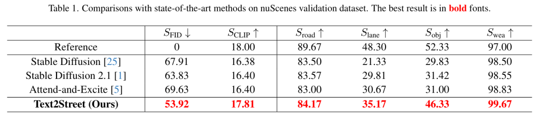 实验表明,Text2Street 在 nuScenes 数据集上显著优于 Stable Diffusion 等模型(车道计数准确率提升 14.91%,目标计数准确率提升 16.5%),验证了其在复杂街景生成中的可控性和有效性。
