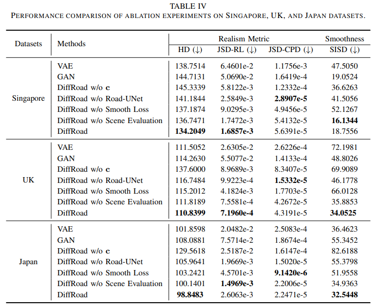 生成真实且多样化的道路场景对于自动驾驶车辆的测试和验证至关重要。然而,由于真实世界道路环境的复杂性和多变性,为智能驾驶测试创建真实且多样化的场景具有挑战性。本文提出DiffRoad,一种新型扩散模型,旨在生成可控制且高保真的3D道路场景。DiffRoad利用扩散模型的生成能力,通过逆向去噪过程从白噪声中合成道路布局,保留真实世界的空间特征。为提高生成场景的质量,本文设计了Road-UNet架构,优化主干网络和跳跃连接之间的平衡,以实现高真实感的场景生成。此外,本文引入了一个道路场景评估模块,该模块使用两个关键指标——道路连续性和道路合理性——筛选适合智能驾驶测试的充分且合理的场景。在多个真实世界数据集上的实验结果表明,DiffRoad能够生成真实且平滑的道路结构,同时保持原始分布特性。此外,生成的场景可以完全自动化转换为OpenDRIVE格式,便于通用的自动驾驶车辆仿真测试。