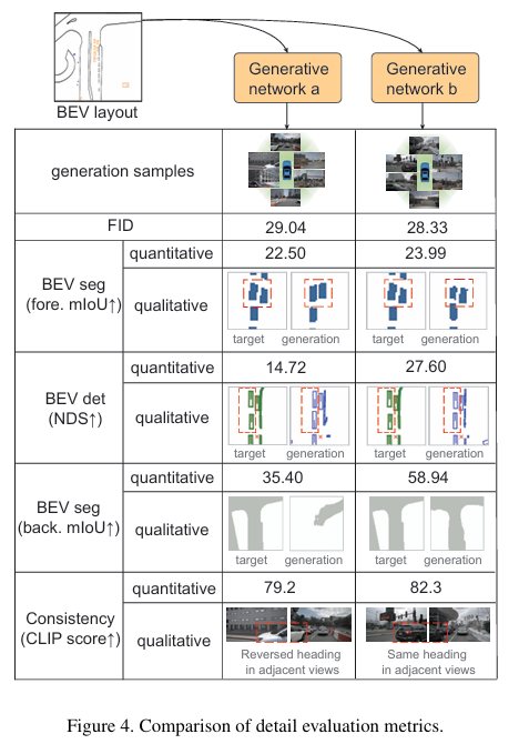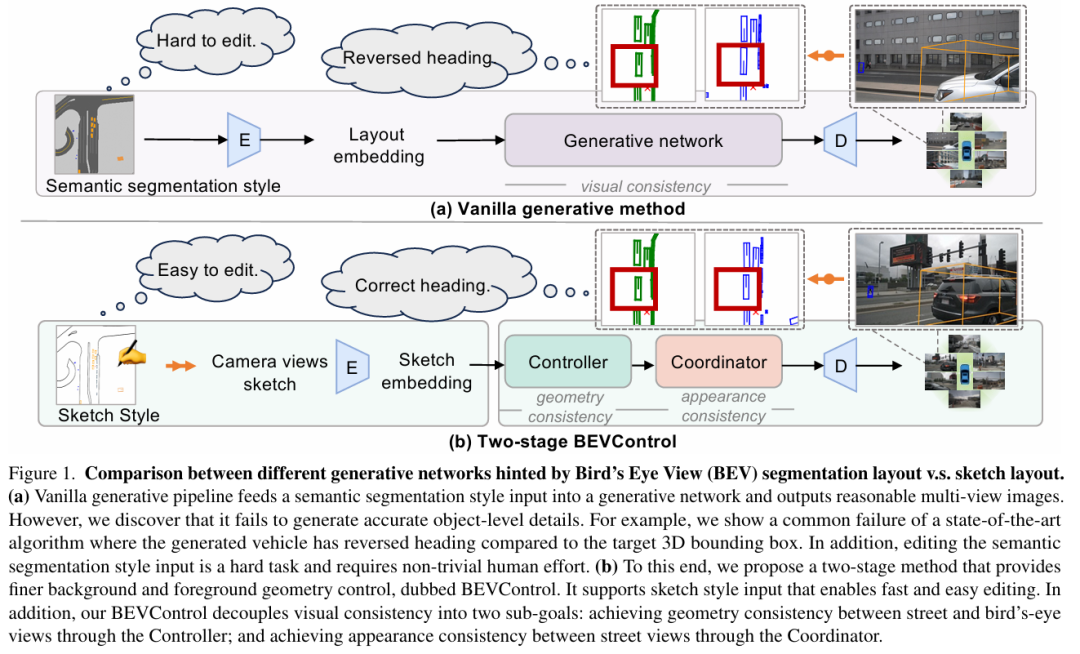 利用合成图像提升感知模型性能是计算机视觉领域的长期挑战。在以视觉为中心的多摄像头自动驾驶系统中,该问题尤为突出,因为某些长尾场景难以通过实际采集获取。现有生成网络在BEV分割布局的引导下,虽在场景级指标下能合成逼真的街景图像,但放大后常无法生成准确的前景(如车辆朝向)和背景细节。为此,本文提出一种两阶段生成方法 BEVControl,可精确控制前景与背景内容。与分割式输入不同,BEVControl支持草图式输入,更便于人工编辑。此外,本文提出一套多层级评估协议,综合衡量生成场景、前景目标及背景几何的质量。大量实验表明:BEVControl在前景分割mIoU上显著超越当前最优方法BEVGen(5.89→26.80);使用其生成图像训练下游感知模型,NDS指标平均提升1.29。