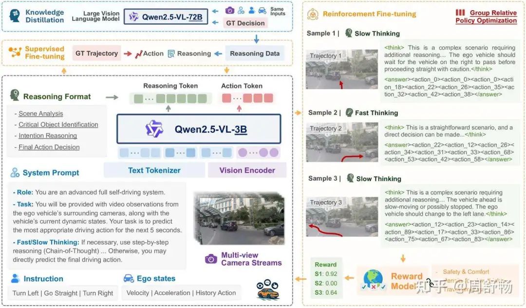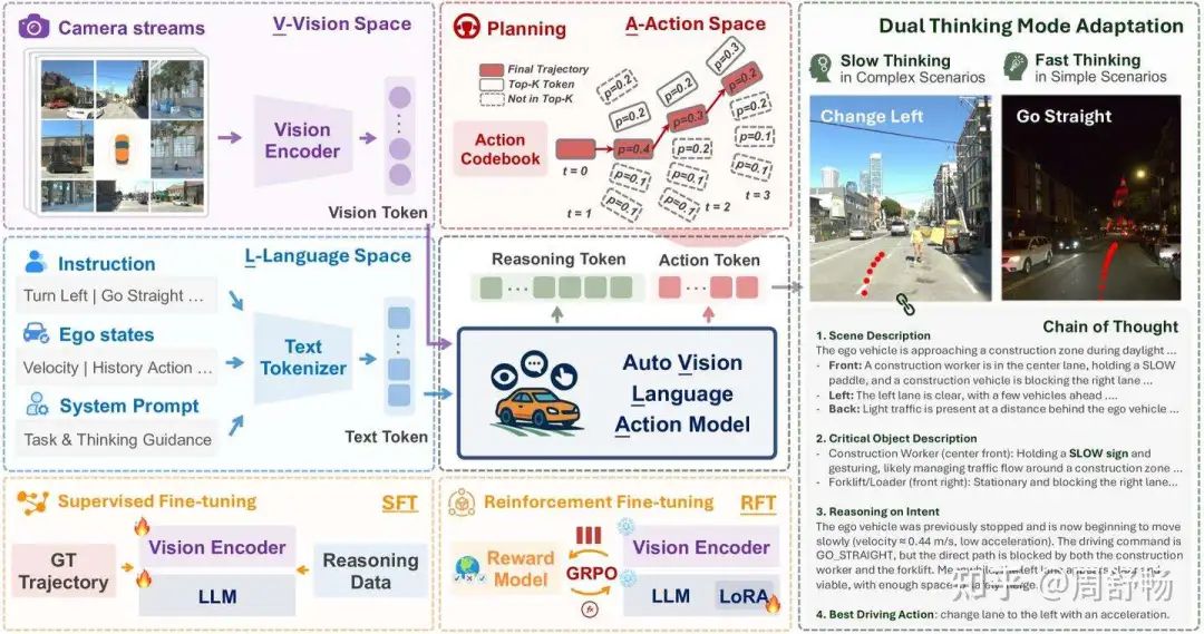 双模式思维与监督微调 (SFT): 模型通过监督微调学习两种决策模式:快速思维: 对于简单的场景,训练数据只包含最终的动作Token序列。模型学习直接输出动作。慢速思维: 对于复杂的场景,训练数据包含结构化的思维链(CoT)文本,后面再跟着动作Token序列。模型学习先进行显式推理,再做出决策。 这使得模型能够根据场景的复杂性自适应地调整其推理深度,兼顾了效率和效果。其SFT损失函数结合了标准的语言模型损失和针对动作Token的辅助损失: