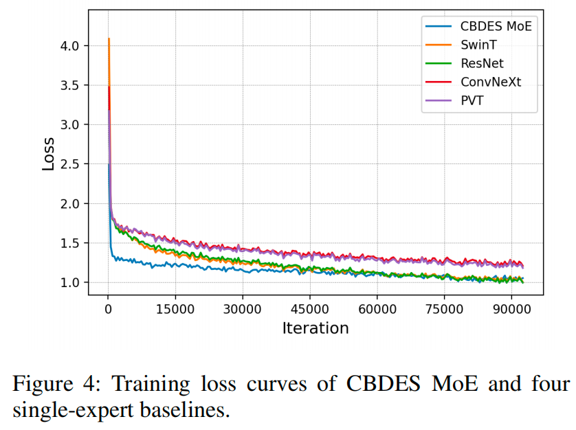 除了精度指标外,我们还在图4中比较了训练过程。CBDES MoE表现出更快的收敛速度,并在整个训练过程中保持更低的损失,表明其优化稳定性更高,学习效率更优。
