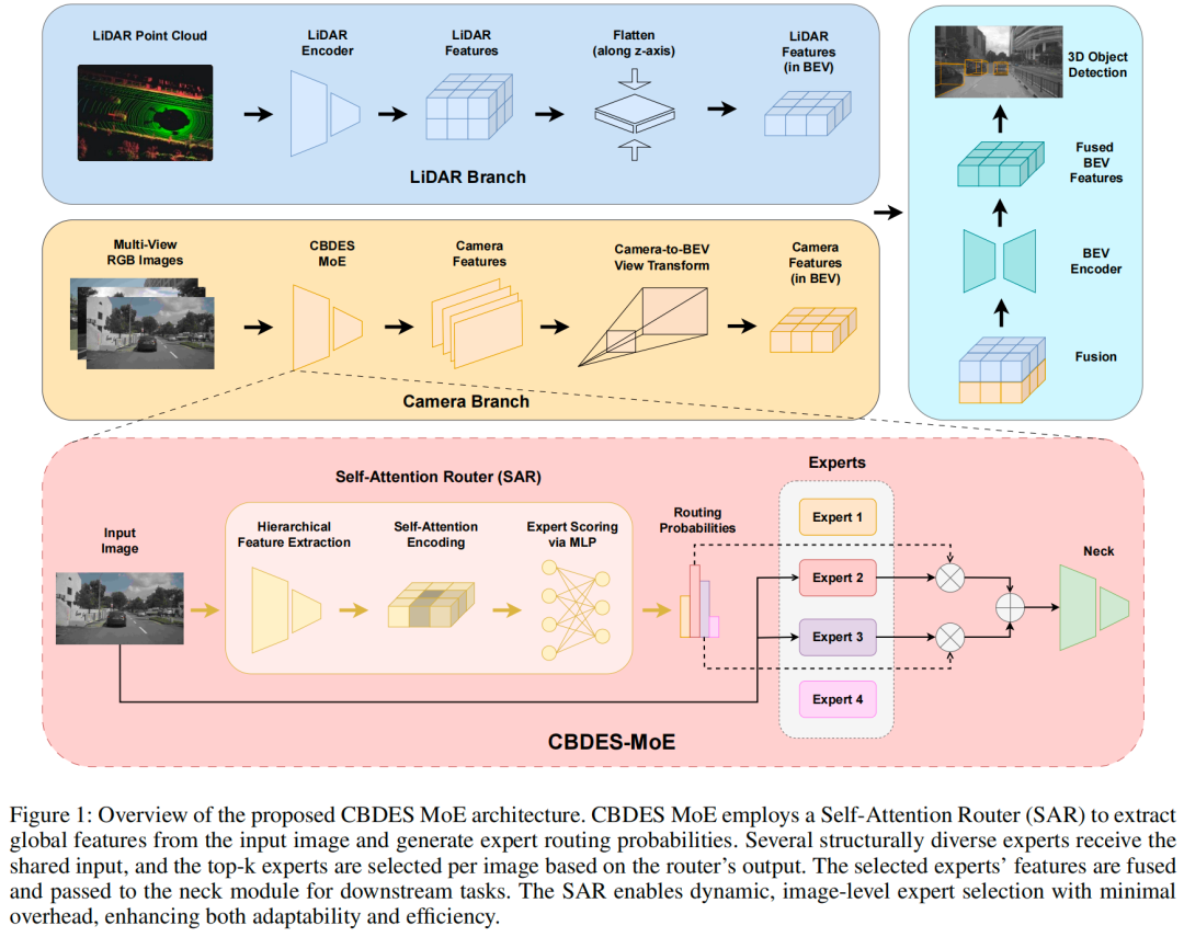 为应对这些挑战,先前的研究探索了自适应模块,例如动态卷积和可变形注意力。尽管这些技术提高了局部灵活性,但仍局限于刚性的单一网络结构。由于缺乏粗粒度的架构适应性,此类模型难以根据输入变化动态重新分配计算资源,从而阻碍了其在安全关键型自动驾驶系统中的大规模部署。专家混合(Mixture-of-Experts, MoE)范式提供了一种新的的解决方案。通过基于学习到的路由机制实现动态专家选择,MoE模型能够在计算效率和表示丰富性之间灵活平衡。尽管MoE在自然语言处理和视觉-语言任务中取得了显著成功,但其在基于BEV的三维感知中的潜力尚未得到充分挖掘。特别是,设计适用于多模态融合的异构专家backbone和路由策略,仍面临独特挑战,尚未得到充分解决。