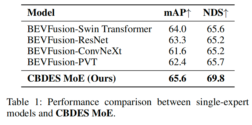 我们将CBDES MoE集成到官方的BEVFusion代码库中进行性能评估。四个专家——Swin Transformer、ResNet、ConvNeXt和PVT——均在ImageNet-1K上进行了预训练,并被适配以匹配BEVFusion相机分支的输入-输出接口。