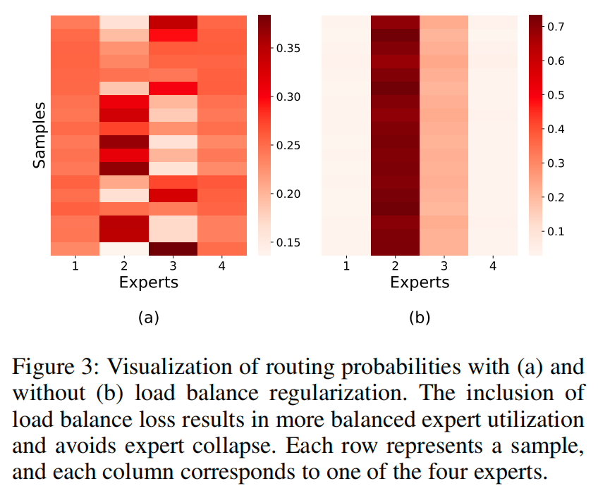 为更好地理解负载均衡损失对专家利用率的影响,我们在图3中可视化了路由器的行为。两个热图分别展示了在有和没有负载均衡正则化项的情况下,分配给每个专家的软路由概率。