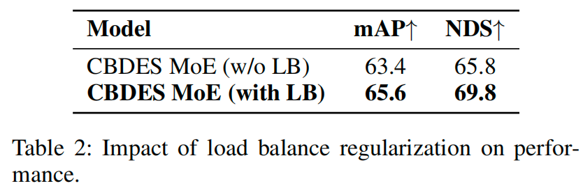 如表2所示,使用负载均衡正则化的CBDES MoE在mAP和NDS上均显著优于未使用该正则化的版本。