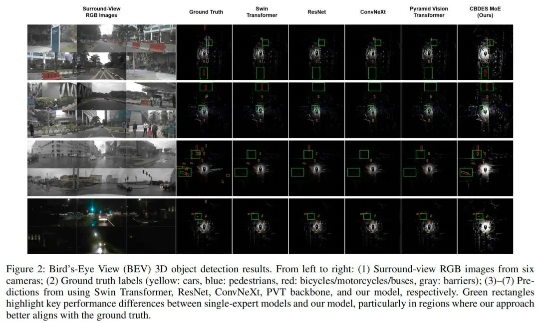 为进一步说明这些定量提升,图2展示了在四种不同环境条件下代表性场景的BEV 3D目标检测结果的定性比较。前两行描绘了能见度良好的正常白天场景,而第三和第四行展示了更具挑战性的条件:第三行包含雨雾,第四行为夜间拍摄。在所有场景中,CBDES MoE产生的结果与GT更为接近,尤其是在绿色框标出的区域。