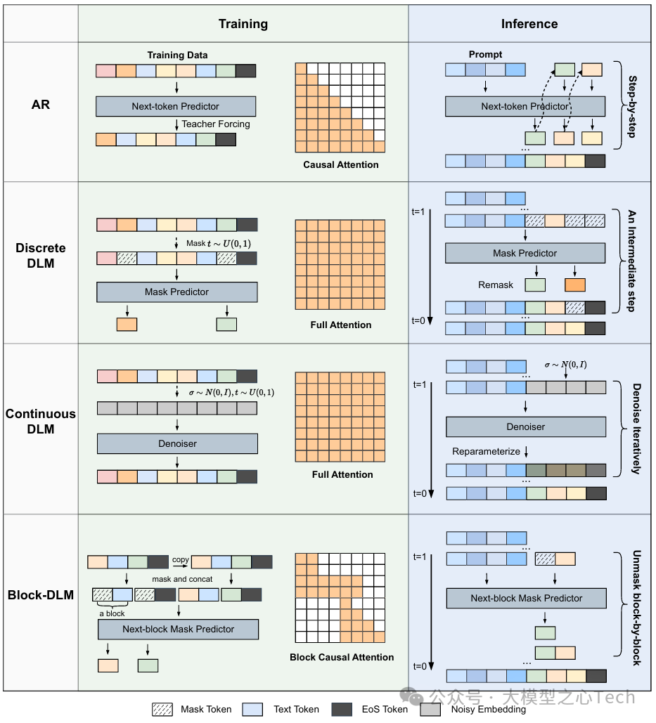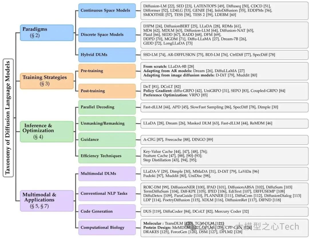 DLM的技术突破不仅在于范式创新,更在于训练策略与推理优化的持续迭代。综述用大量篇幅拆解了DLM在「如何高效训练」与「如何快速推理」上的关键技术,这些细节直接决定了DLM的产业落地能力。