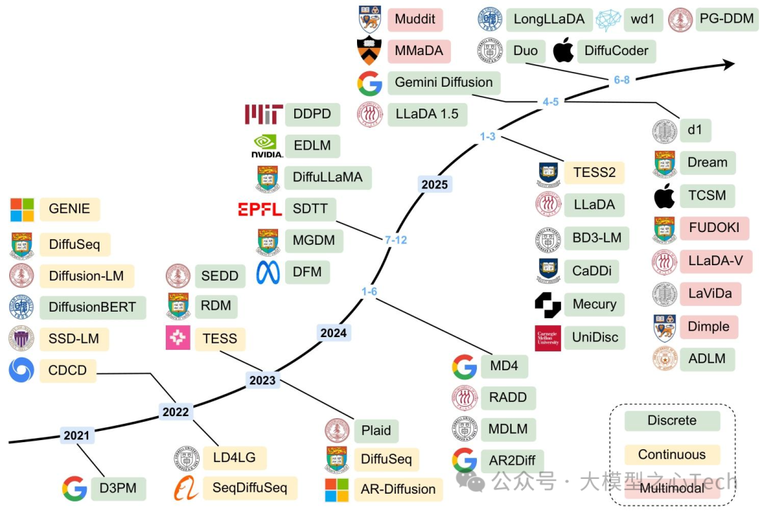 从2021年D3PM提出离散扩散概念,到2025年LLaDA-8B比肩LLaMA3-8B,DLM用四年时间完成了从「理论验证」到「实用化」的跨越。这份综述不仅梳理了DLM的技术脉络,更揭示了一个核心趋势:大模型的竞争已从「参数规模」转向「效率与可控性」,而DLM正是这一趋势的代表。