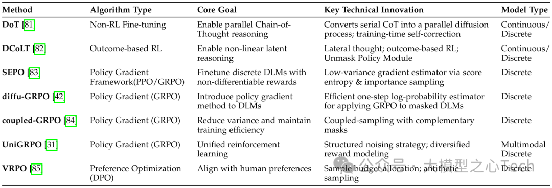 除了初始化方式,DLM的「后训练优化」也是提升性能的关键。综述重点介绍了两种核心技术: