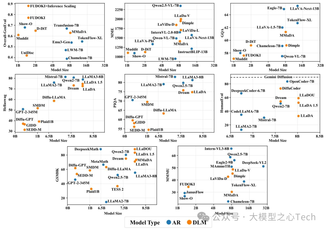 当前最大的公开DLM(如LLaDA-8B、Dream-7B)参数规模仅为8B,远小于AR模型的数百亿甚至万亿参数(如Llama-3.1-405B、Qwen3-235B);同时,DLM的训练数据效率也较低——达到同等性能,DLM需要的训练数据量约为AR模型的1.5-2倍。