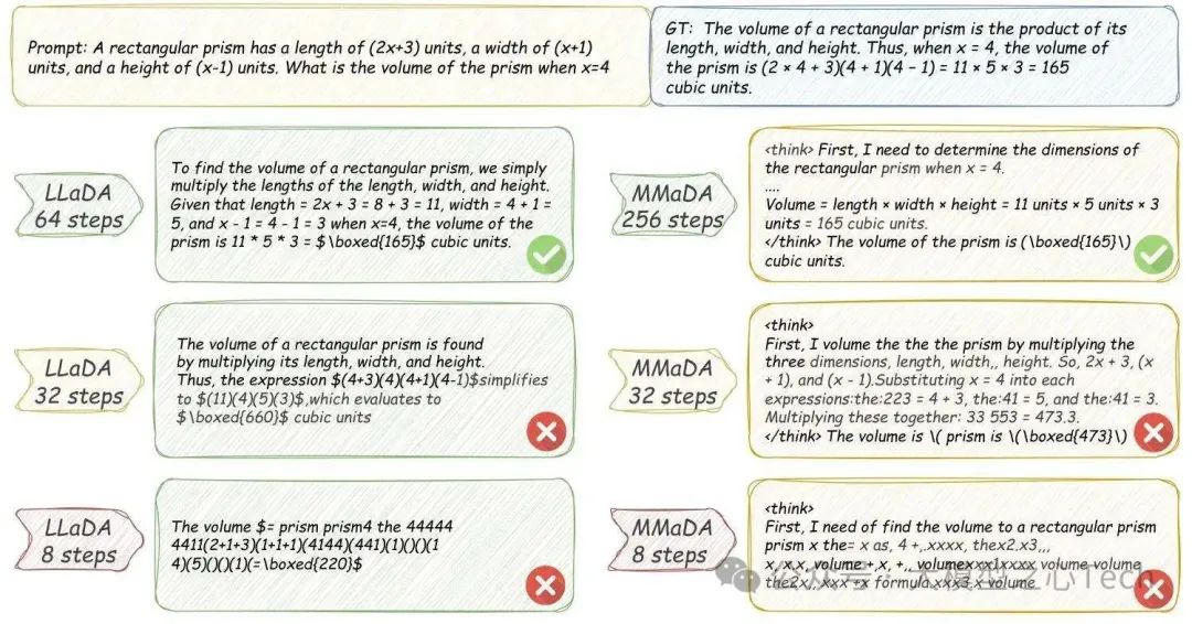 这种问题在「低步数推理」时尤为明显——当去噪步数从256减少到32,LLaDA的GSM8K准确率会从78%下降到45%,而AR模型不受步数影响。尽管研究者提出了「置信度解码」「辅助模型引导」等方案,但尚未从根本上解决,仍是DLM性能提升的最大瓶颈。