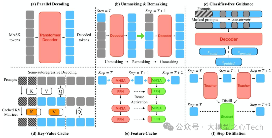 DLM推理的核心成本在于「多轮去噪的重复计算」,综述中提出的三类技术有效解决了这一问题: