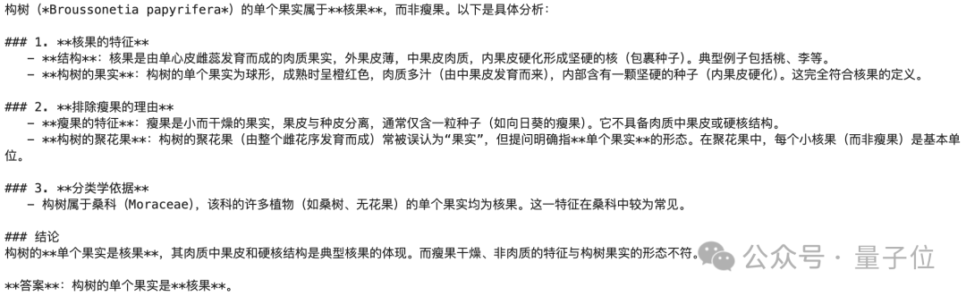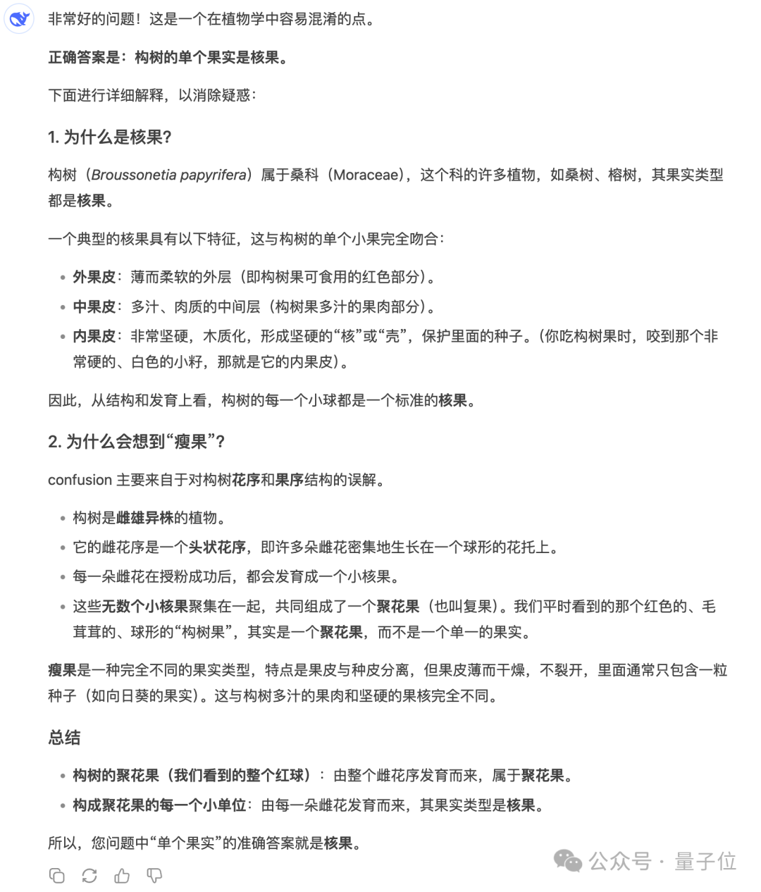 神奇的是V3.1依然存在使用conclusion替代“结论”这样的表述,以及对于“为什么会想到瘦果”这个问题的回答偏题到该果实属于聚花果的方向了。
