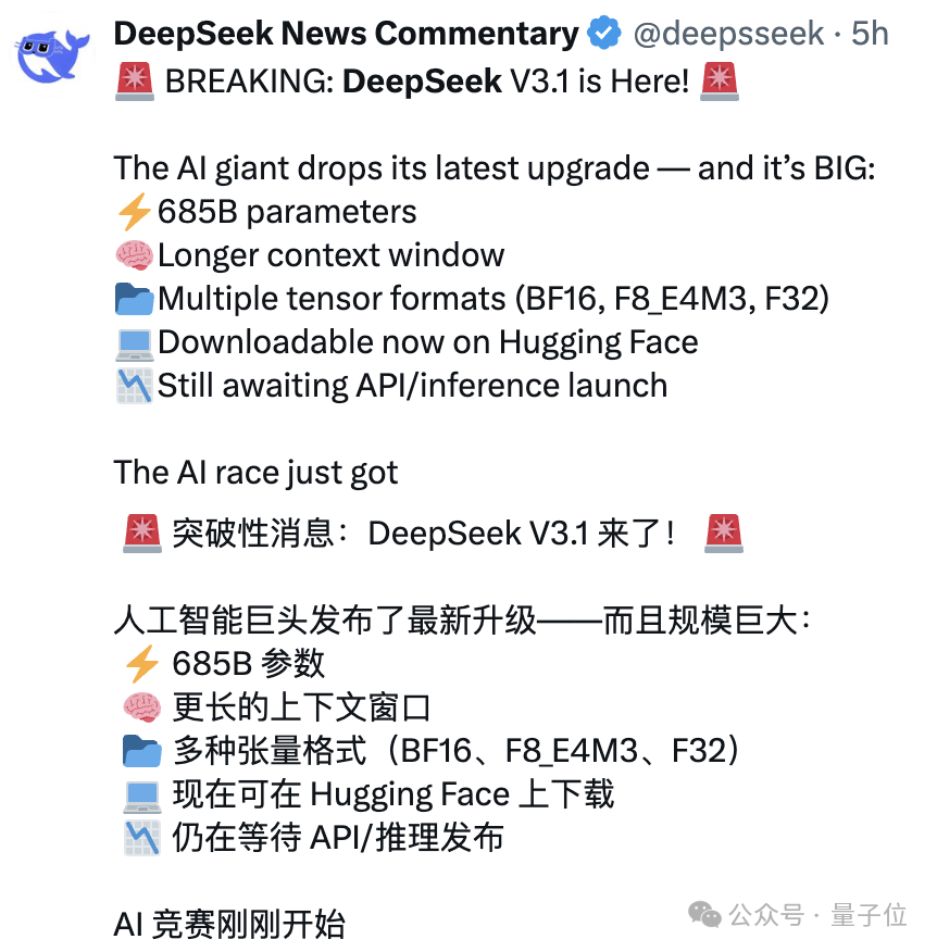 当前DeepSeek V3.1 Base可在抱抱脸上下载,也可通过网页、APP和小程序使用完整版本。