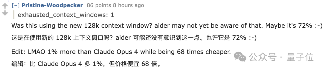 这是什么概念——有网友解释到,这意味着它比Claude Opus 4得分多1%,但价格便宜68倍。