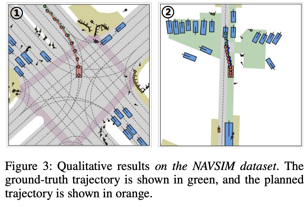 如图 3 所示,在 NAVSIM 数据集上,我们的模型能够准确规划复杂操作,如左转和变道。