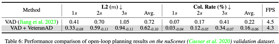 为了进一步验证 VeteranAD 的有效性和泛化能力,我们在 nuScenes 数据集上进行了开环规划实验,结果如表 6 所示。我们在 VAD 的基础上集成了我们的设计,并遵循其训练和推理流程。结果表明,我们的方法将平均 L2 位移误差降低了 0.10 m,并将平均碰撞率减少了 27.2%,相比于 VAD 具有显著提升。