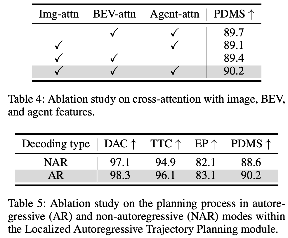 表 3 展示了对两个核心模块的消融实验结果:规划感知整体感知模块 和 局部自回归轨迹规划模块。结果包括完整模型的性能以及单独使用各模块的效果。第一行中,将感知模块中的位置引导注意力替换为普通注意力,会导致 PDMS 下降,说明使用来自锚定轨迹的引导点作为规划先验的重要性。第二行显示,若去掉引导点,直接输出规划轨迹而非预测偏移,也会造成显著的性能下降。这些结果表明,锚定轨迹提供的引导点在准确规划中起到关键作用。当两个模块同时应用时,PDMS 达到 90.2,展示了它们的互补性和整体有效性。