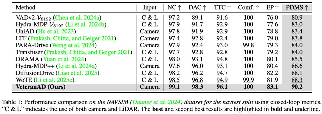 在 NAVSIM 和 Bench2Drive 两个数据集上的大量实验表明,VeteranAD 均取得了当前最优的性能表现。