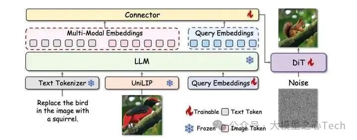 MLLM结构和MetaQuery类似,包含 MLLM、扩散 Transformer、像素解码器、连接器和 个可学习Query。MLLM 采用 InternVL3 - 1B,Pixel Decoder采用了DC-AE,扩散 Transformer 为 SANA - 0.6B,Connector是 6 层 Transformer,与 InternVL3 - 1B 的 LLM 结构一致。