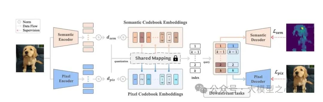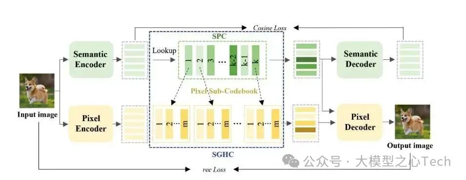 基于上面的步骤训练的semantic codebook即 ,pixel codebook为 ,每一个pixel codebook 和一个semantic codebook里面的code 对应。输入图片经过Pixel Encoder提取特征 ,基于semantic codebook的量化结果选择对应的Pixel codebook,然后对Pixel特征做量化,即
